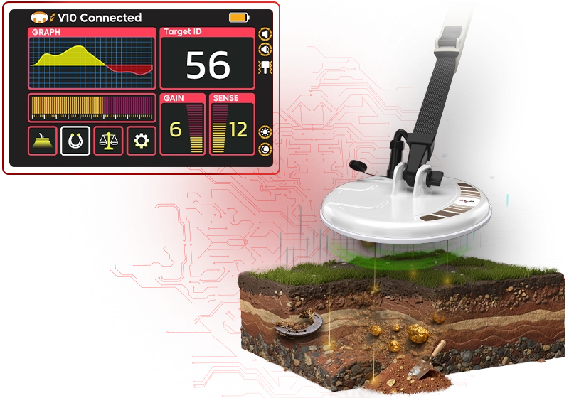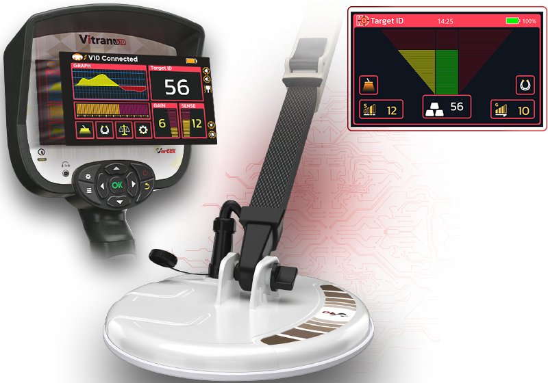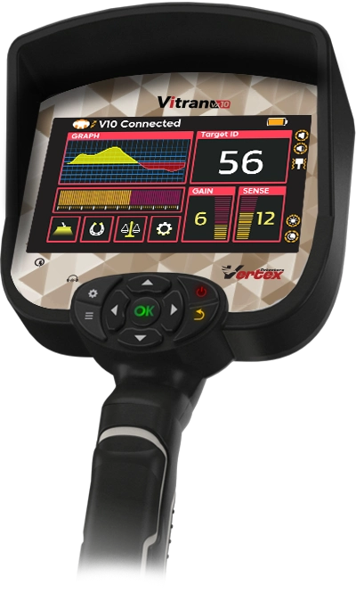 Il VITRAN VX10 è dotato della bobina di ricerca primaria V10 (8×12 pollici), una bobina ad alta sensibilità progettata per rilevare pepite d'oro fini e obiettivi piccoli all'interno di profondità superficiali e medie.