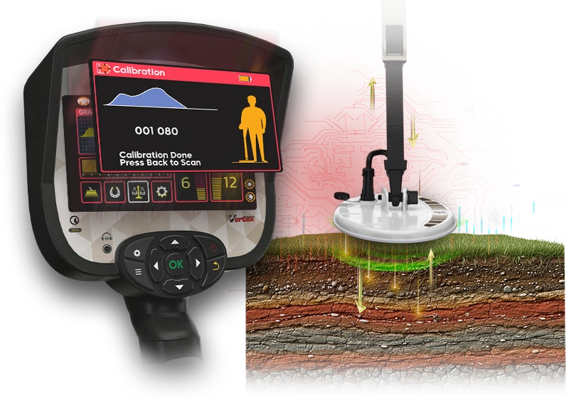 Il rilevatore opera con un sistema di calibrazione del terreno (Auto Ground Balance) completamente automatico che si adatta alle caratteristiche del suolo immediatamente all'avvio, senza alcun intervento manuale, garantendo prestazioni stabili e un'alta precisione in ambienti mineralizzati o salini.