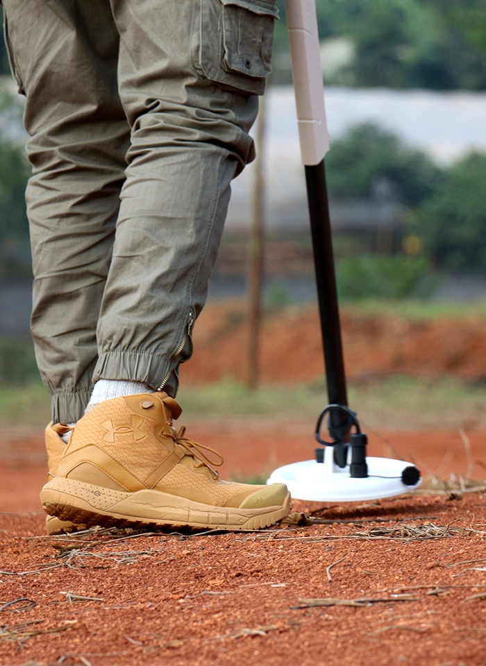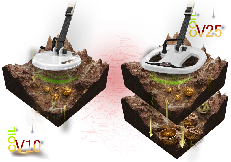 Può anche essere equipaggiato con la bobina opzionale V25 (12×12 pollici) per raggiungere maggiori profondità e rilevare obiettivi medi e grandi con alta precisione e stabilità in diversi tipi di terreno.