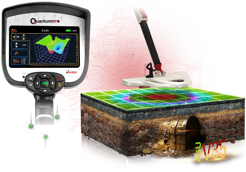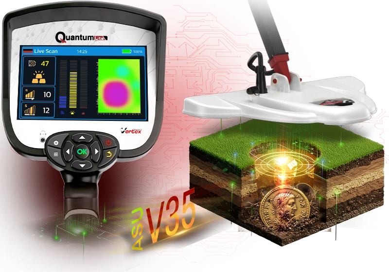 Quantum Lite не просто подает сигналы; он предлагает многослойное изображение, интеллектуальный анализ, дискриминацию металлов и точную обратную связь с грунтом благодаря передовому Блоку Активного Зондирования V35.